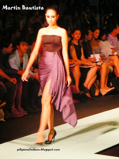 Lyle IbaƱez’s collection was arresting in its stark elegance and restrained sexiness. Bereft of any embellishment, each piece was tailored to flatter the body with its seeming fluidity. The rather neutral collection ended with a shot of color with a fluid fuchsia gown.